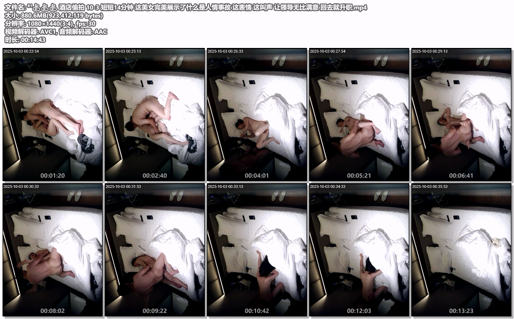 【影片名称】:⁸¹⛳⛳⛳ 酒店偷拍 10-3 短短14分钟 这美女完美展示了什么是人情事故 这表情 这叫声 让领导无比满意 回去就升职